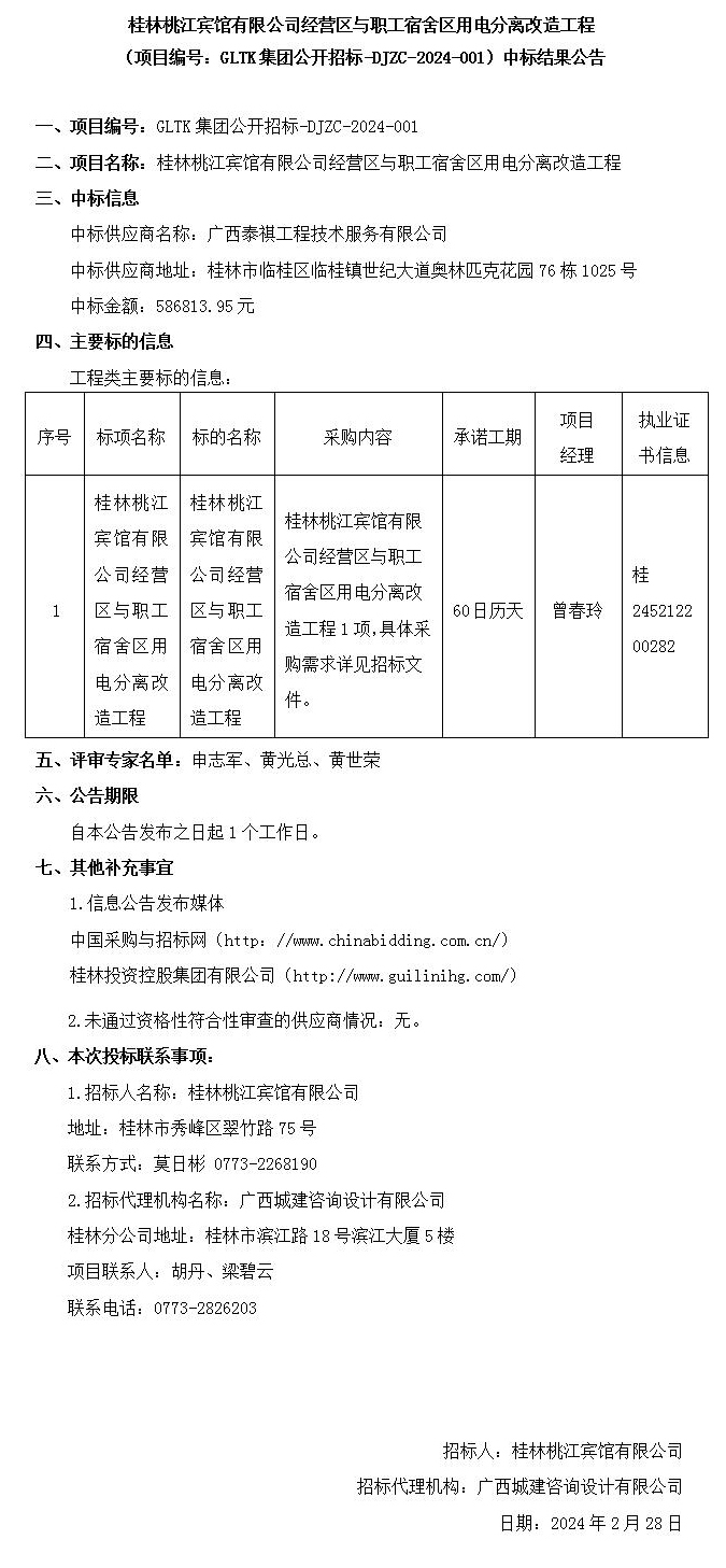 桂林桃江宾馆有限公司经营区与职工宿舍区用电分离改造工程 (项目编号:GLTK集团公开招标-DJZC-2024-001)中标结果公告