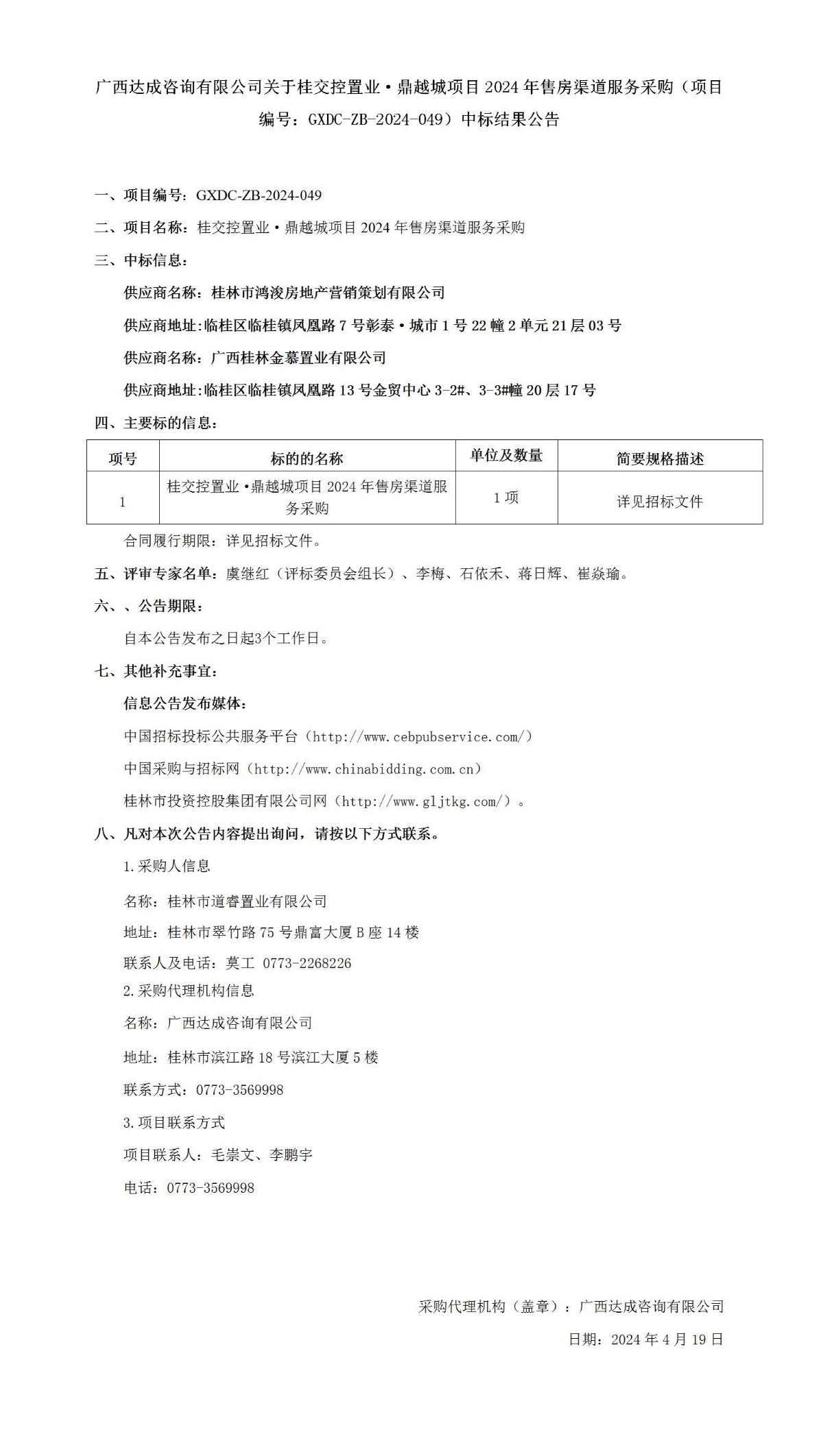 广西达成咨询有限公司关于桂交控置业·鼎越城项目2024年售房渠道服务采购(项目编号:GXDC-ZB-2024-049)中标结果公告