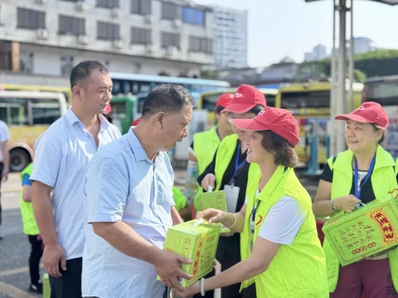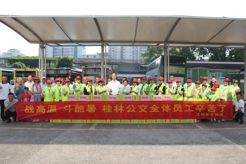 8月13日上午,桂林投资集团公交铁西场站洋溢着浓浓温情,一群佩戴"文明乘客"绶带的市民自发来到这里,将防暑降温饮品送到高温下坚守岗位的公交驾驶员手中。