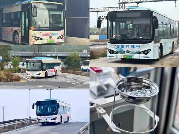 实操项目紧扣大型客车运营实际,包括连续障碍、限宽门等精准操控,拱桥、连续弯路等路况处置,以及针对桂林气候特点设置的雨雾天气、积水路面行驶等应急项目。竞赛创新采用“盛水容器考核法”,通过剩余水量评判平稳驾驶能力,同步记录能耗数据,将“安全”与“节能”纳入双重评分标准。